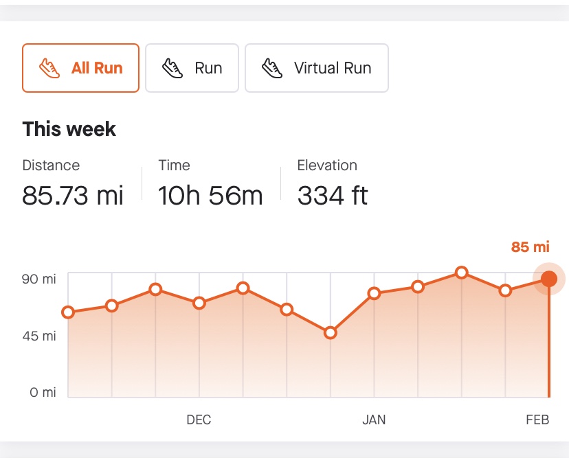 Session day I did on the treadmill, which was 5x1mile then 5x1min all off 2 minutes jog recovery. This went well, better than I expected, nailed the paces I wanted. Body and mind started to feel much better by mid week, seem to got back on top of sleep, hydration and recovered from the race. Completed the weekly volume in 85 miles which was what I wanted.