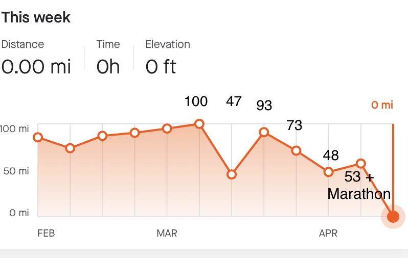 So the last 5 weeks in my training block , what happened? I ran my biggest volume in the block of 100 miles, so the rest of the block looked like this volume wise , 100, 47 ( moving home week) , 93, 75, 48, 53( including Race)