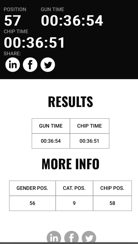 After completing a good warm up and seeing some familiar faces, I got myself into the starting position and we were soon off, I set out with intent, and got myself into the pace I wanted to which was around 5:45 pace, I settled and got into a good rhythm, ticking off miles 1and 2, the crowds where amazing and seeing my coach around 2.5 mile mark gave me a boost. There is a very slight incline headed back towards the start line but nothing major, the pace was start to pinch around mile 4 but was digging deep and kept pushing through, but hitting around mile 5 and a bit I got a horrible stitch down my right hand side which slowed me down from 5:50 to 6:20 but I just ran as hard as I could through to the line and came home in 36:51, a 2sec Pb happy with that and I know that come the summer I’ll have another crack at that time.